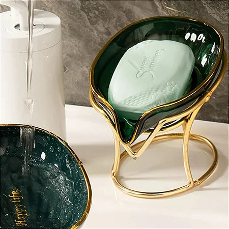 1) Formato de folha para barra de  sabonete com sistema de drenagem. 2) Guarnição dourada projetada para segurar o sabonete, o que faz com que a água flua naturalmente. 3) Design antiderrapante. 4) Suporte do sabão é fabricado por tecnologia avançada para obter um alto grau de estabilidade. 5) Encaixa perfeitamente na bancada e não é fácil de deslizar. 6) Saboneteira multiuso.