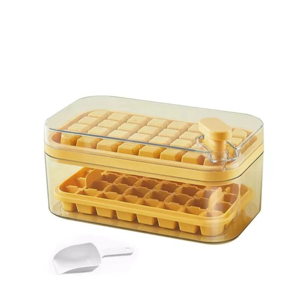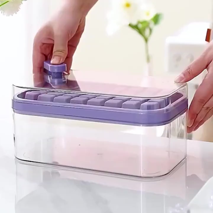 Com a Caixa de Molde de Gelo com Clique, você pode remover e obter facilmente de 32 a 64 cubos, simplesmente através de uma prensa.