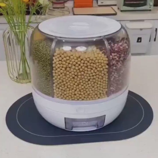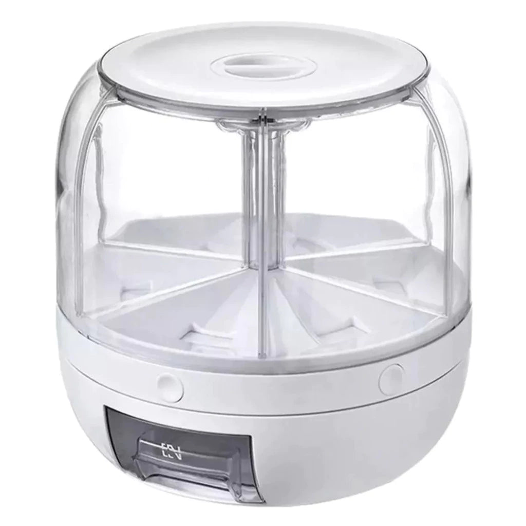 1) Sistema rotativo 360° facilitando acesso a cada compartimento. 2) Design hermético justamente para proteger contra a umidade e conservar o frescor. 3) Transparência para facilitar a visualização e monitoramento dos alimentos. 4) Capacidade de até 10 kg. 5) Com 6 recipientes, é um produto inovador e prático que permite armazenar e dispensar diferentes tipos de grãos e alimentos de forma simples e organizada. 6) Cada recipiente tem seu próprio dispensador. 7) Mecanismo de fácil utilização que permite a liberação controlada evitando desperdícios e mantendo a higiene. 8) Design moderno para você aproveitar!