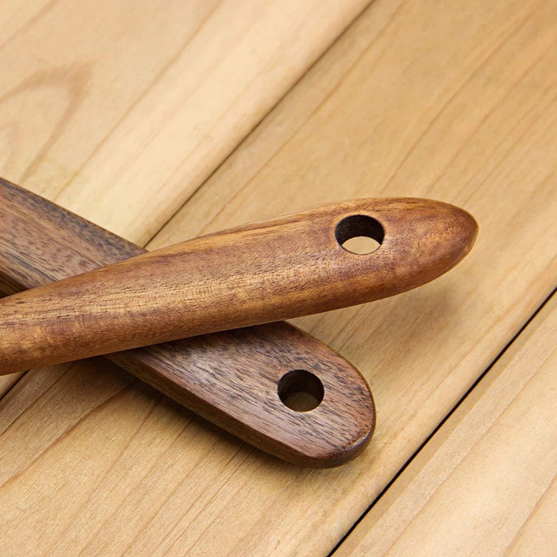 Utensílios práticos e funcionais, com furos suspensos para armazenar facilmente na parede. Confeccionado em madeira natural de ACACIA com alça grossa, forte. Perfeitamente lixado e liso.